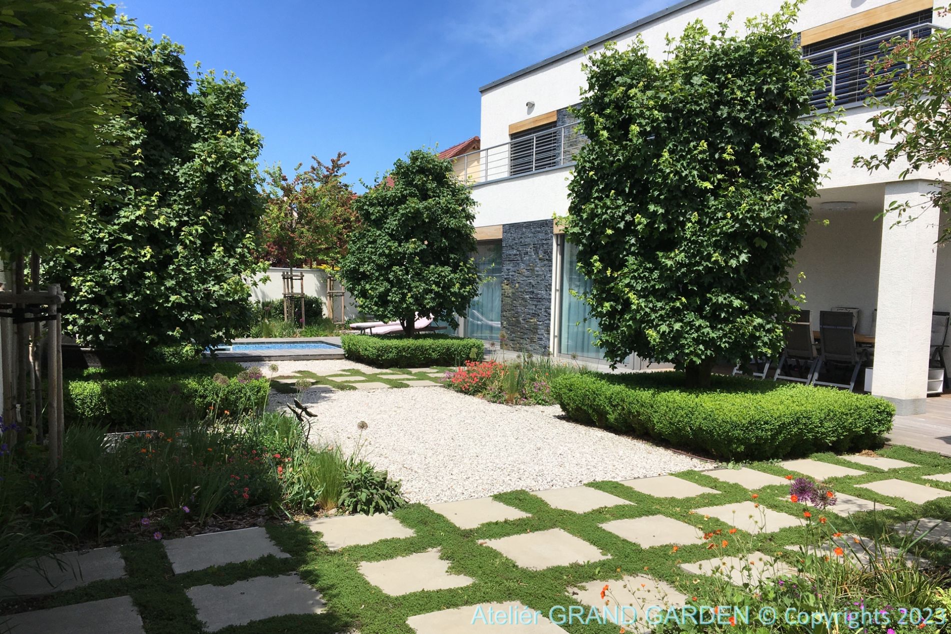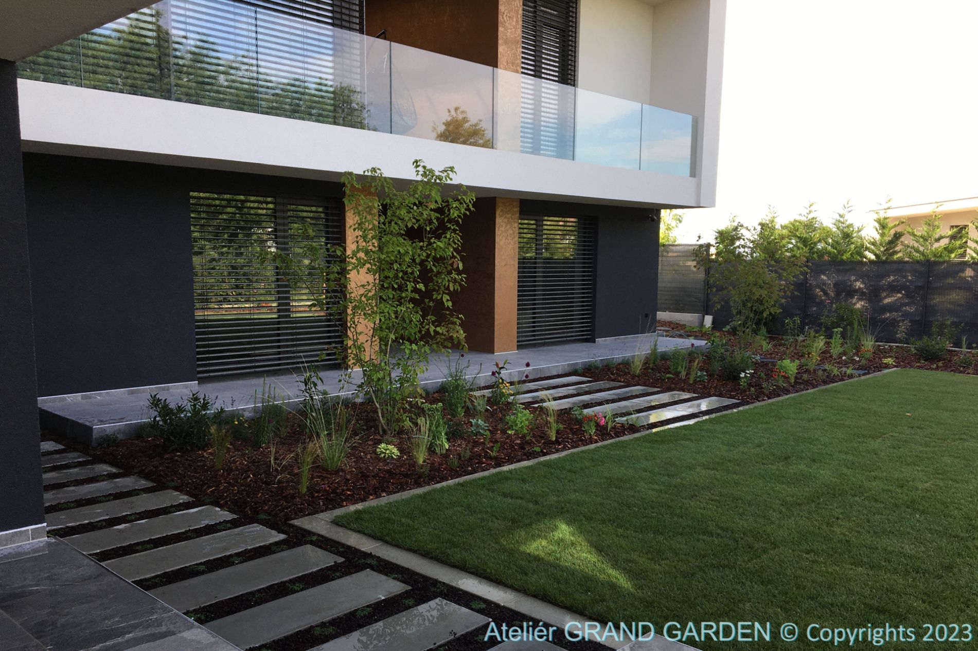 Lemy a šľapáky sú v našej tvorbe nezastupiteľné a kladieme na ne veľký dôraz. Ich materiálové prevedenie môže byť vskutku rôznorodé. Radi používame betónovú dlažbu, mrazuvzdorné tehly, nerezové lišty, či pohľadový betón. Kotvíme ich v betónovom lôžku, čo im zaručuje dlhodobú funkčnosť. Úplne ignorujeme plastové obruby, ktoré podľa nás do moderných záhrad nepatria.