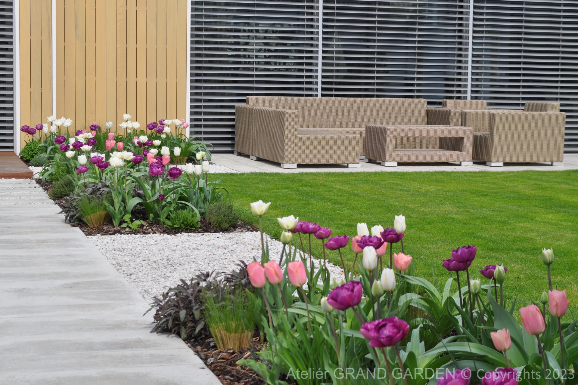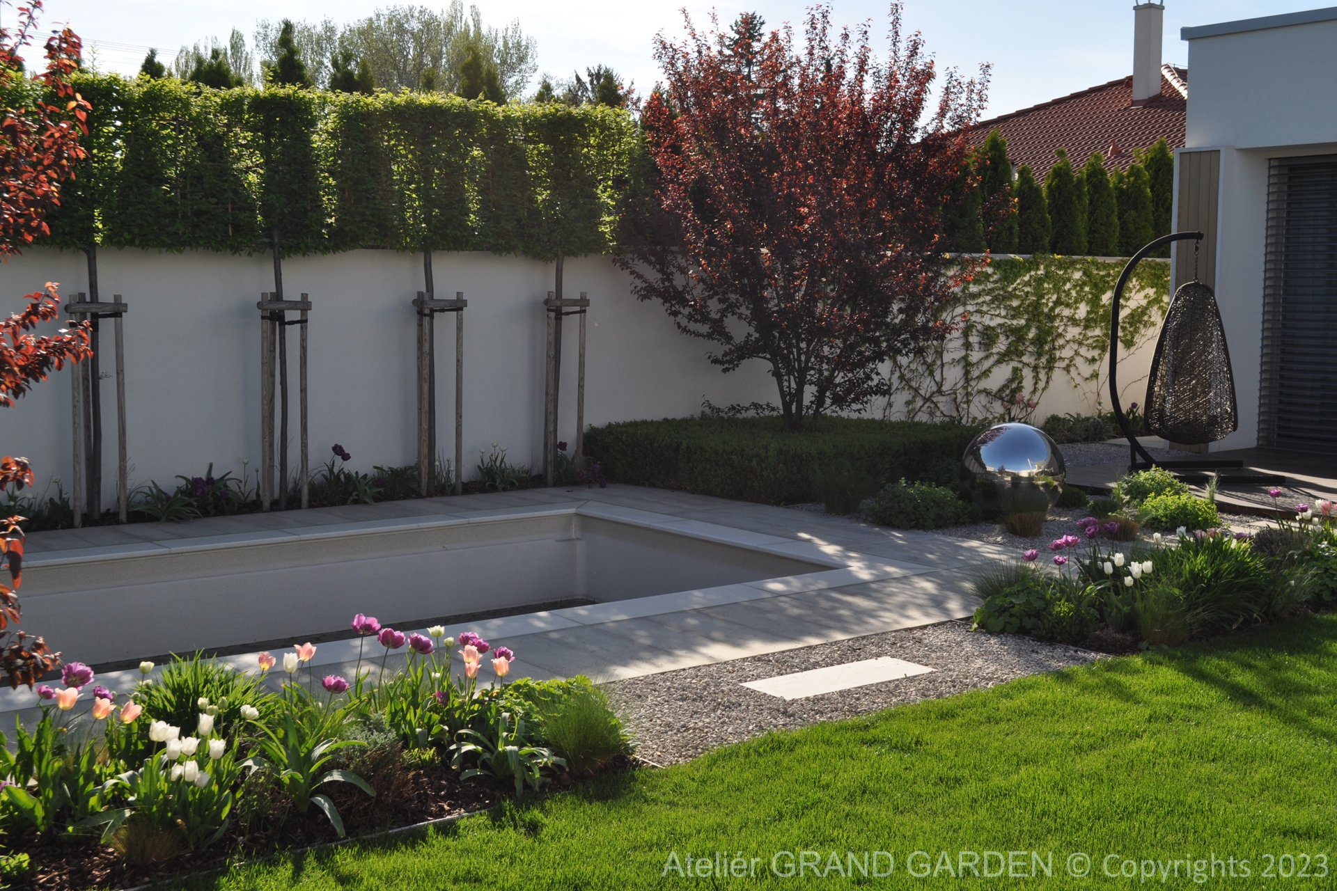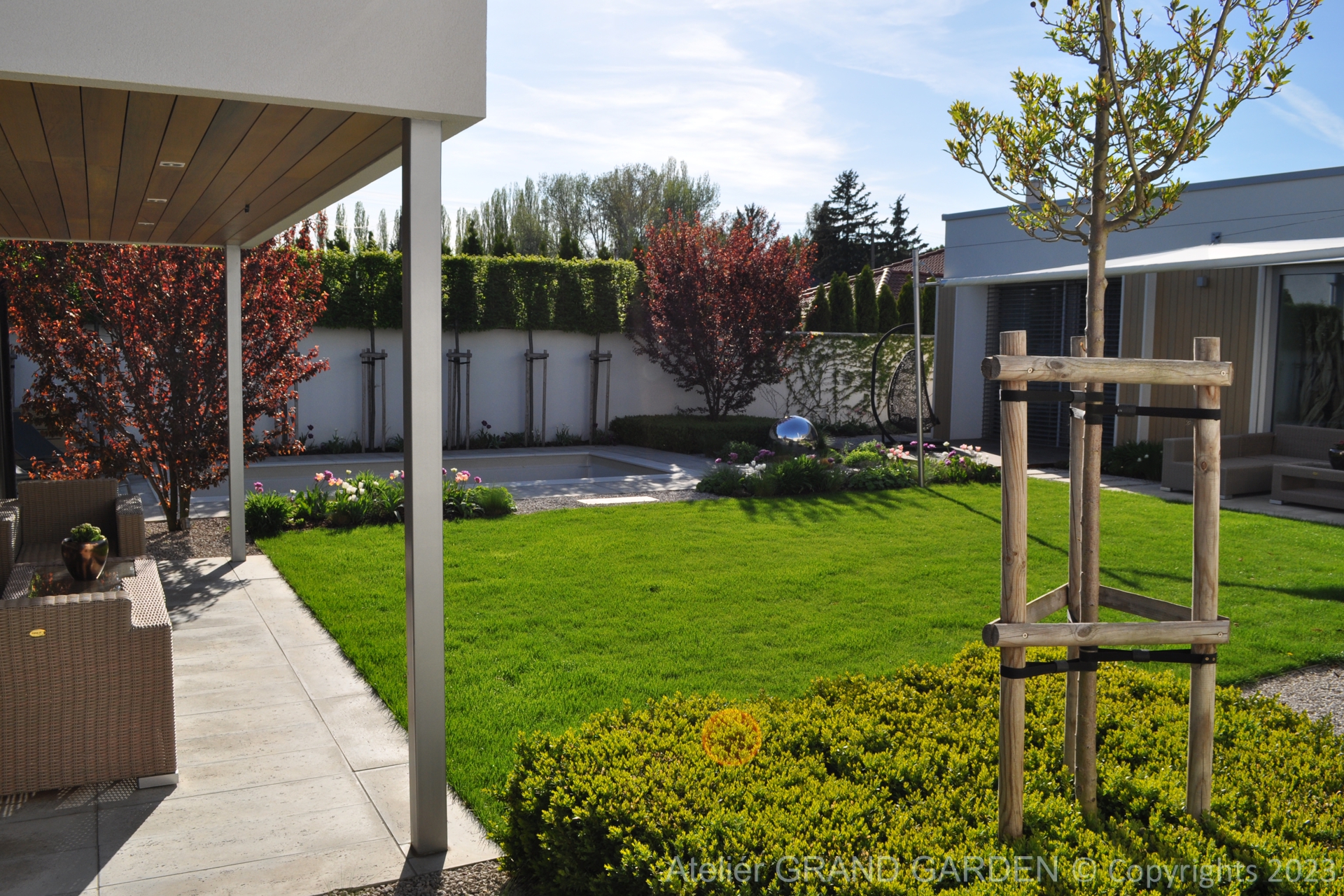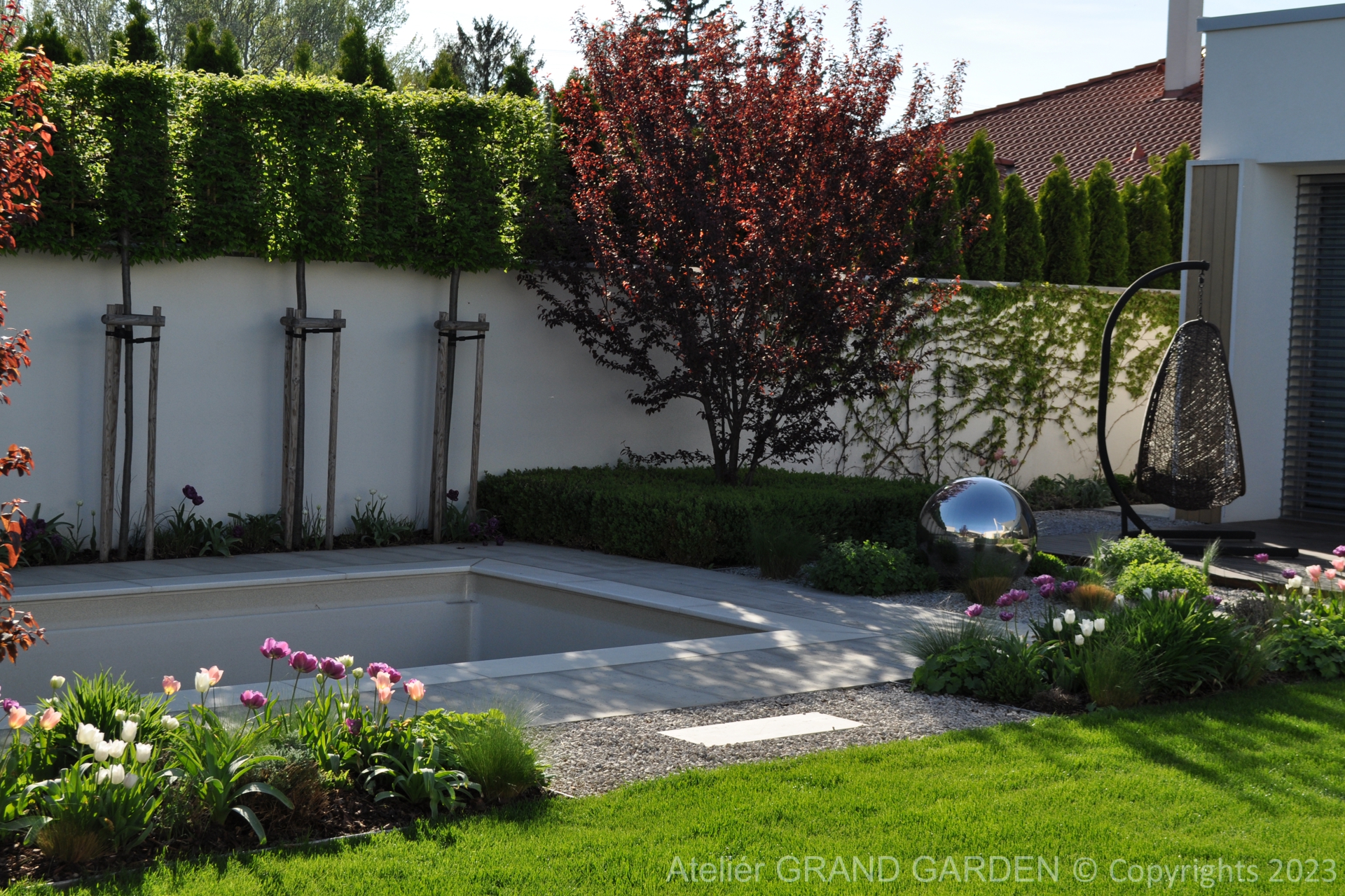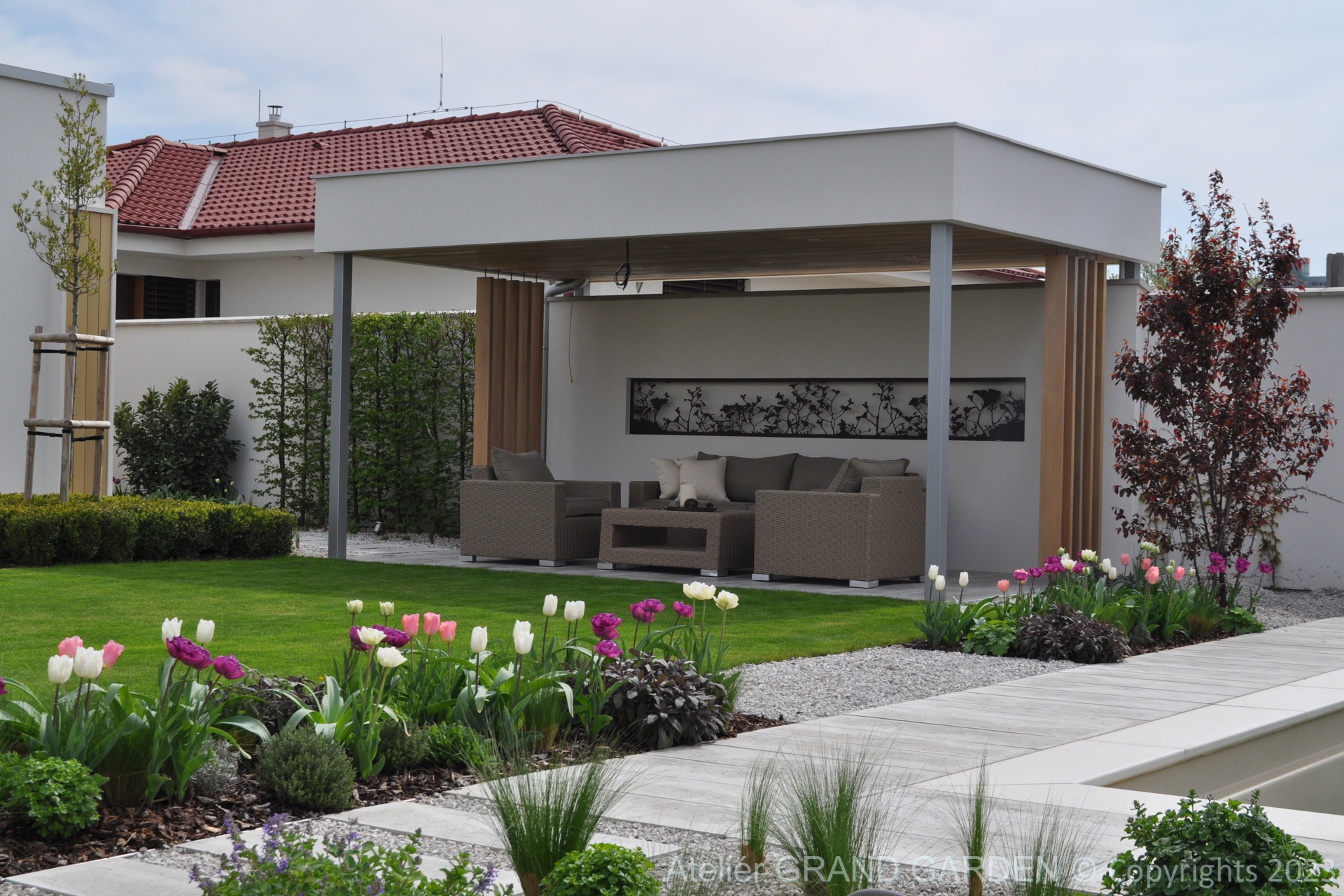 Elegantný moderný dom s čistými líniami a jednoduchými striedmymi materiálmi vyžadoval kompozične jednoducho riešenú záhradu, plnú detailov a prekvapení. Priestranná južná terasa pri dome pokrytá palubovkou z tropického dreva, jednoduchý a vzdušný prístrešok s multimediálnymi prvkami, bazén "rodinných" rozmerov, supersexi úložňa dreva so skrytým priestorom pre záhradné vybavenie, to všetko premieňa túto záhradu v kombinácii s estetickými doplnkami v modernú, elegantnú relaxačnú oázu. Premenlivá trvalkovo-trávová výsadba v kombinácii so vždyzelenými blokmi z krušpánov, vysokými hrabovými palmetami ako aj bohatá jarná výsadba cibuľovín oživujú a sprírodňujú strohé línie a zjemňujú charakter priestoru. To všetko v umiernenej rovnošate elegancie a jednoduchosti.