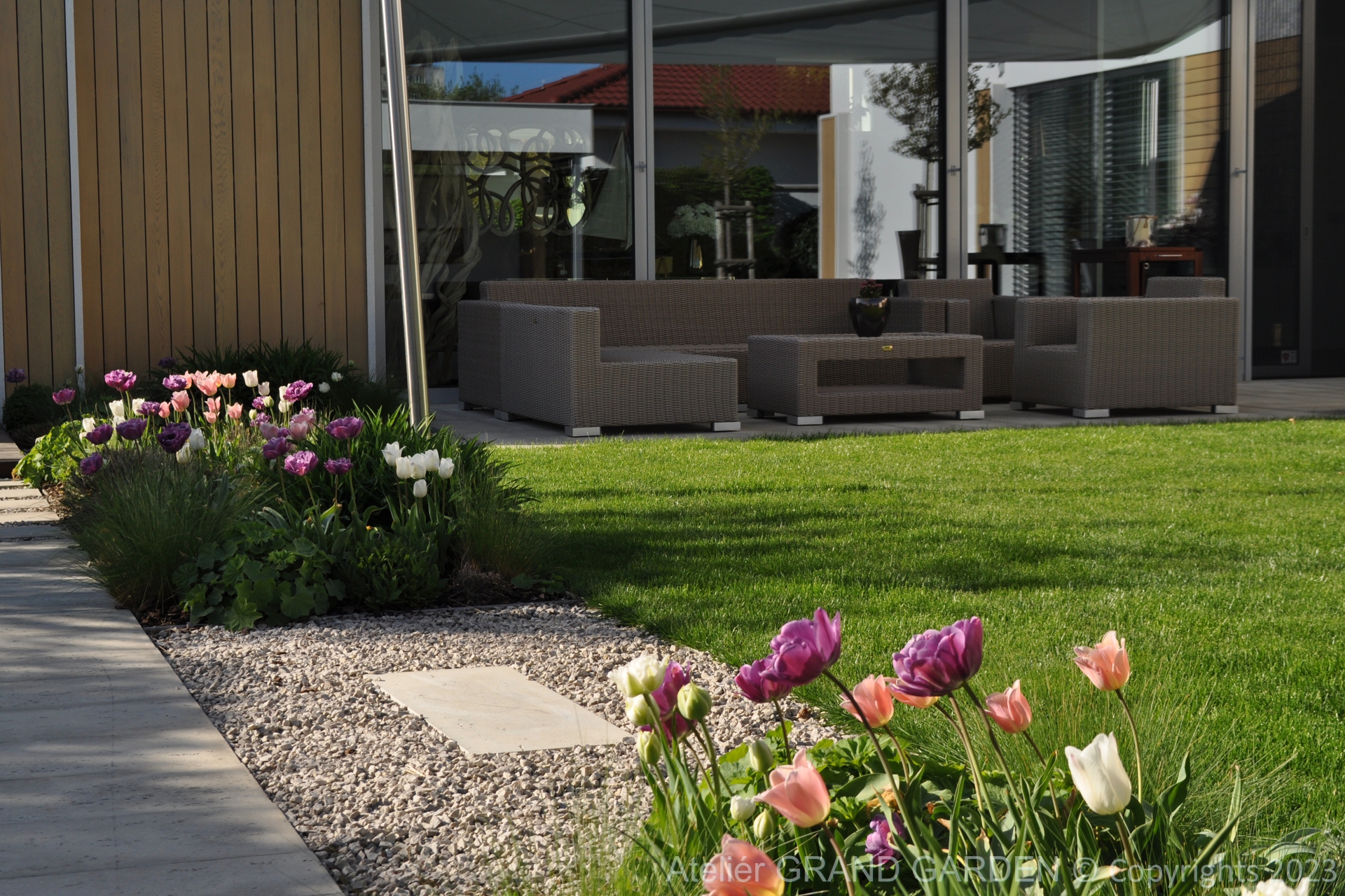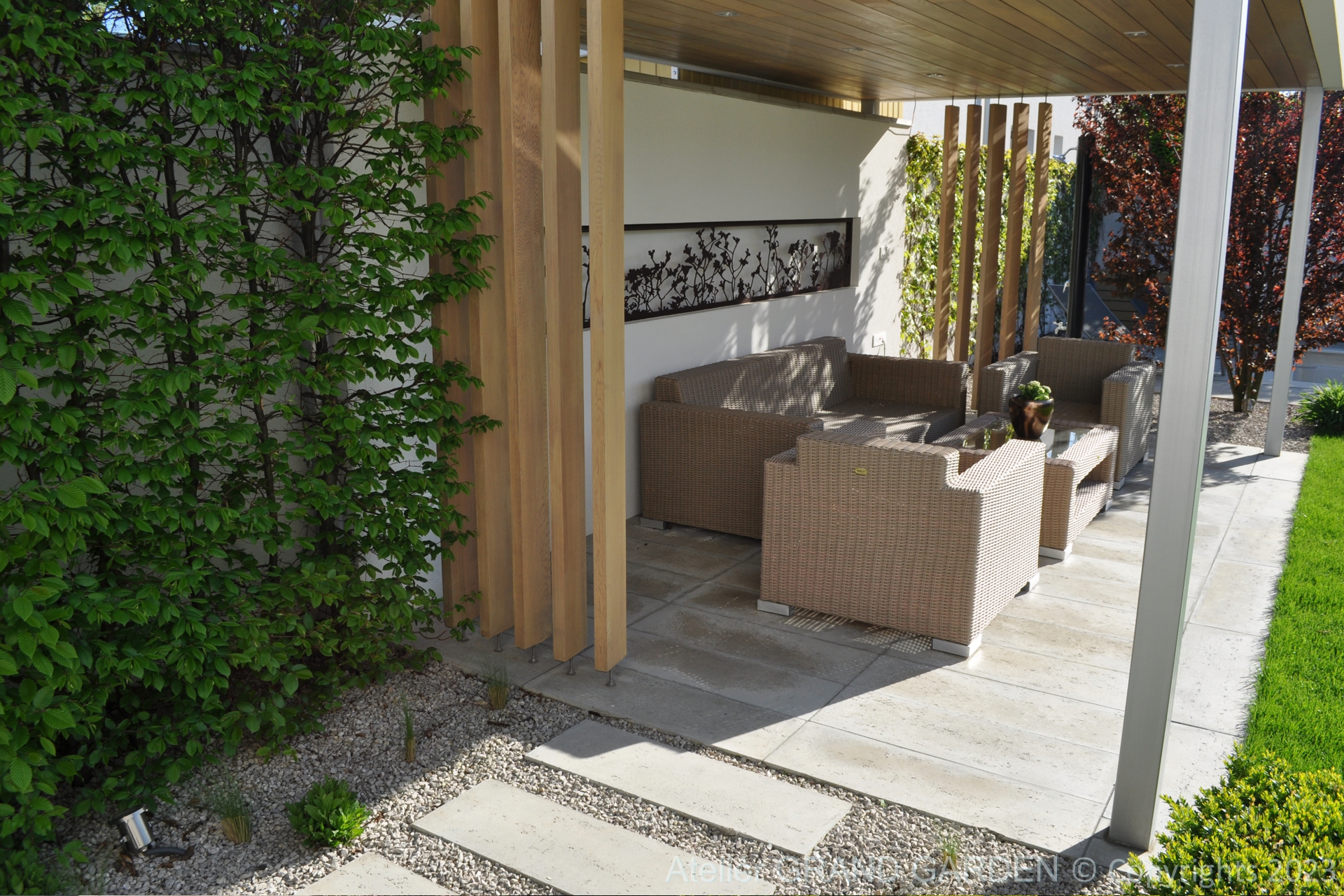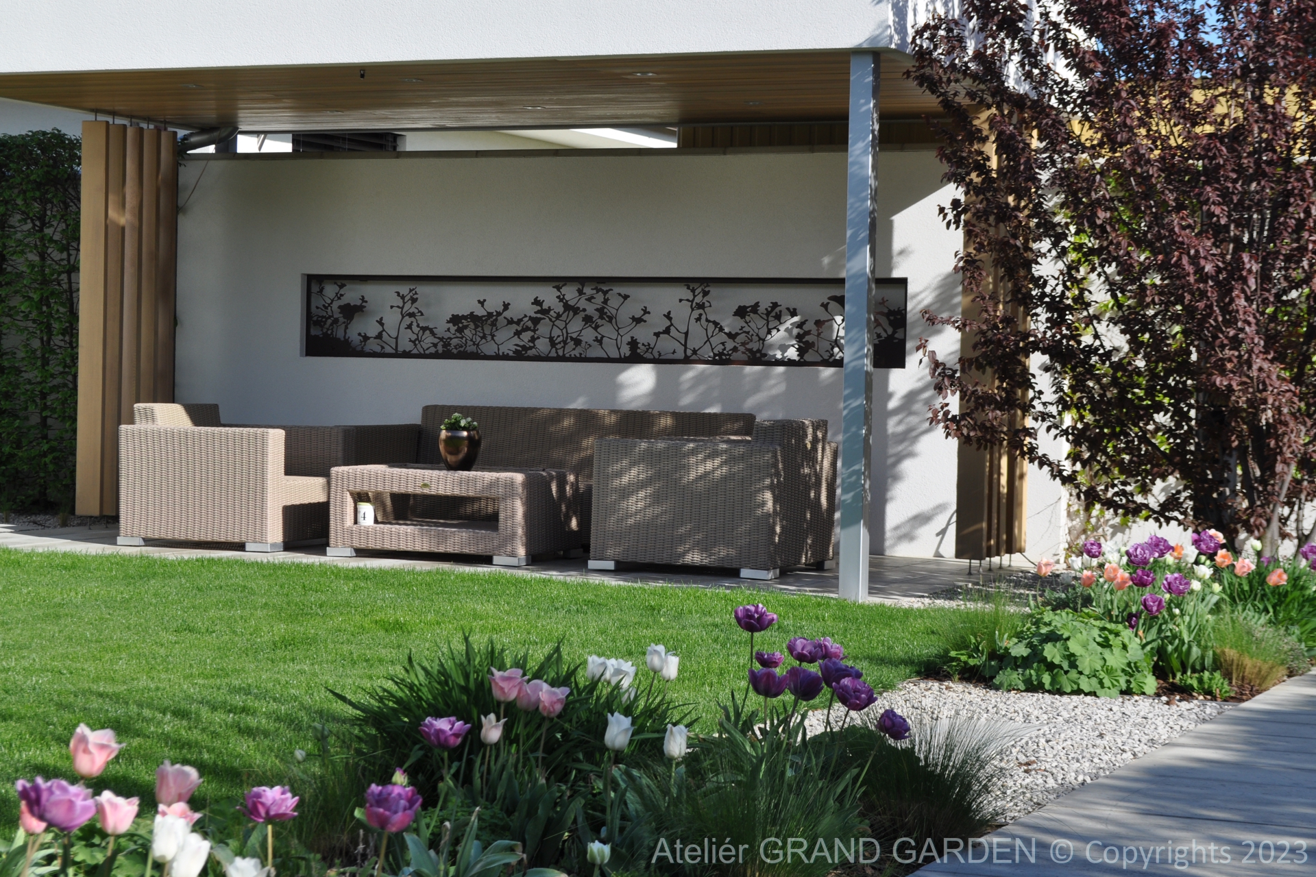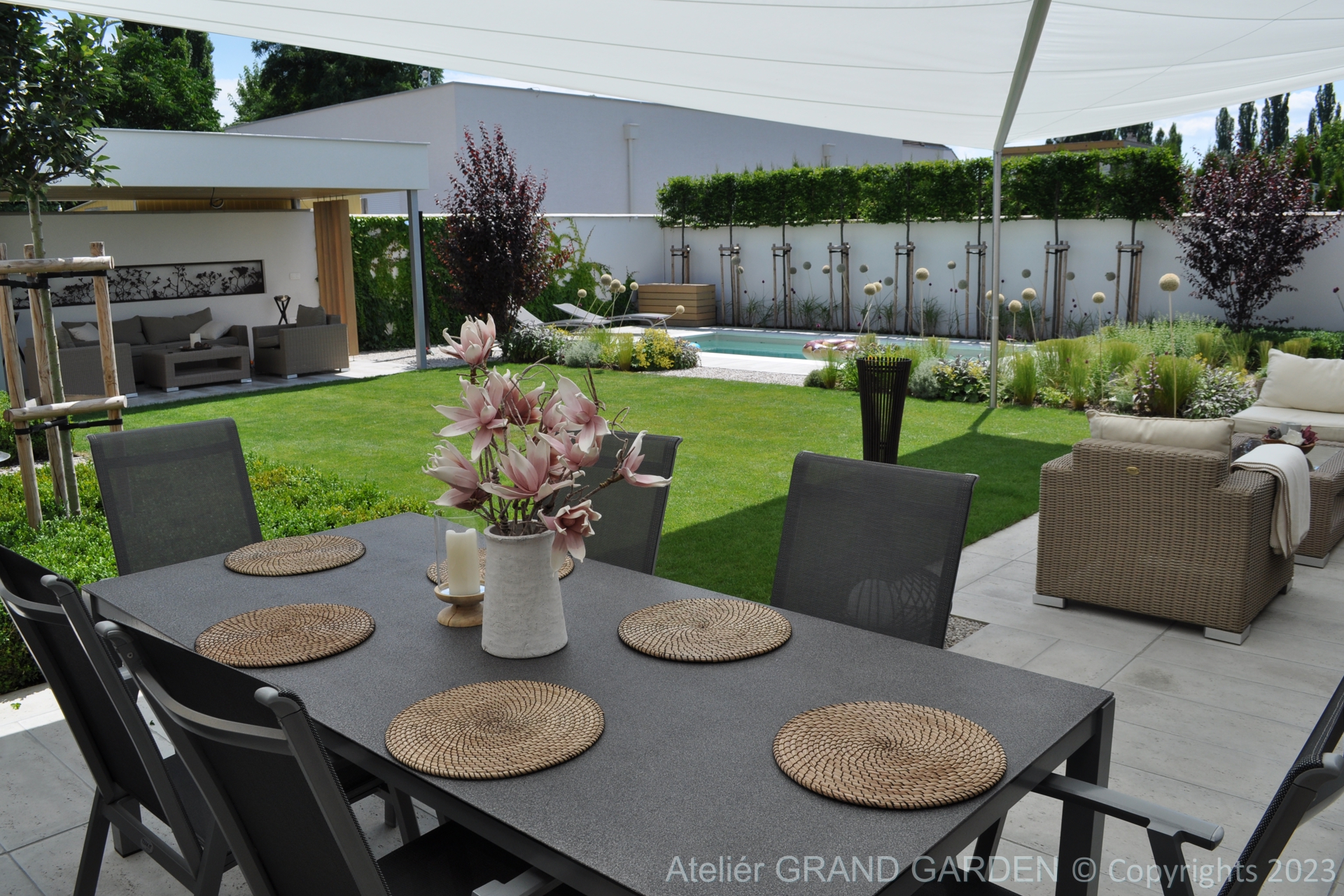 Elegantný moderný dom s čistými líniami a jednoduchými striedmymi materiálmi vyžadoval kompozične jednoducho riešenú záhradu, plnú detailov a prekvapení. Priestranná južná terasa pri dome pokrytá palubovkou z tropického dreva, jednoduchý a vzdušný prístrešok s multimediálnymi prvkami, bazén "rodinných" rozmerov, supersexi úložňa dreva so skrytým priestorom pre záhradné vybavenie, to všetko premieňa túto záhradu v kombinácii s estetickými doplnkami v modernú, elegantnú relaxačnú oázu. Premenlivá trvalkovo-trávová výsadba v kombinácii so vždyzelenými blokmi z krušpánov, vysokými hrabovými palmetami ako aj bohatá jarná výsadba cibuľovín oživujú a sprírodňujú strohé línie a zjemňujú charakter priestoru. To všetko v umiernenej rovnošate elegancie a jednoduchosti.