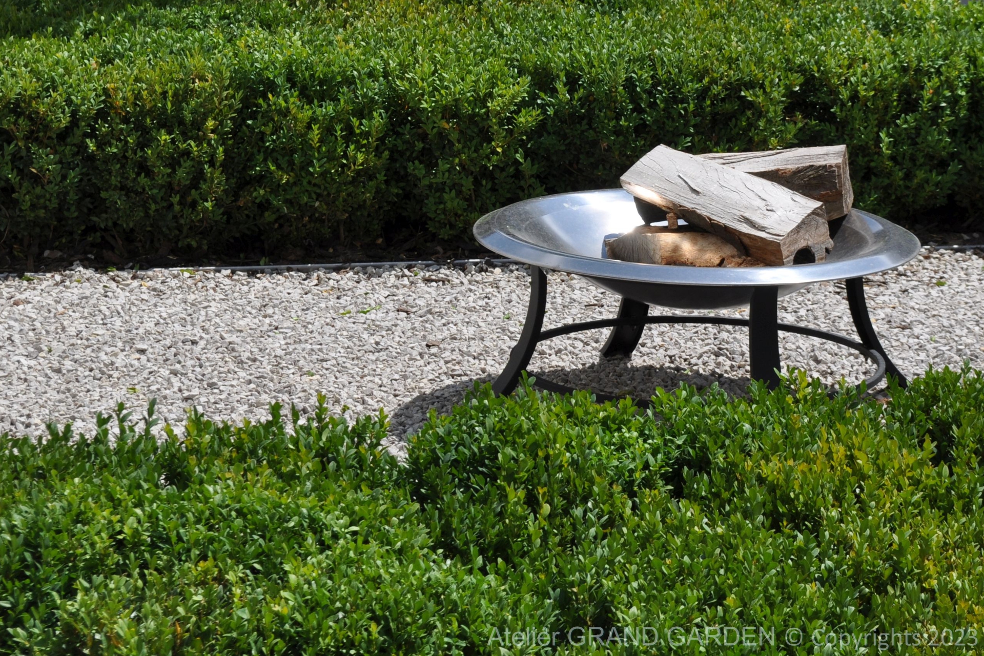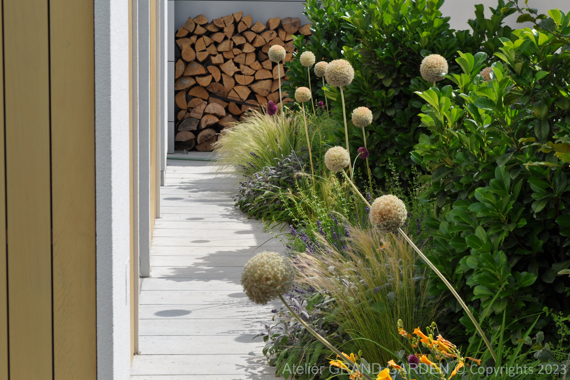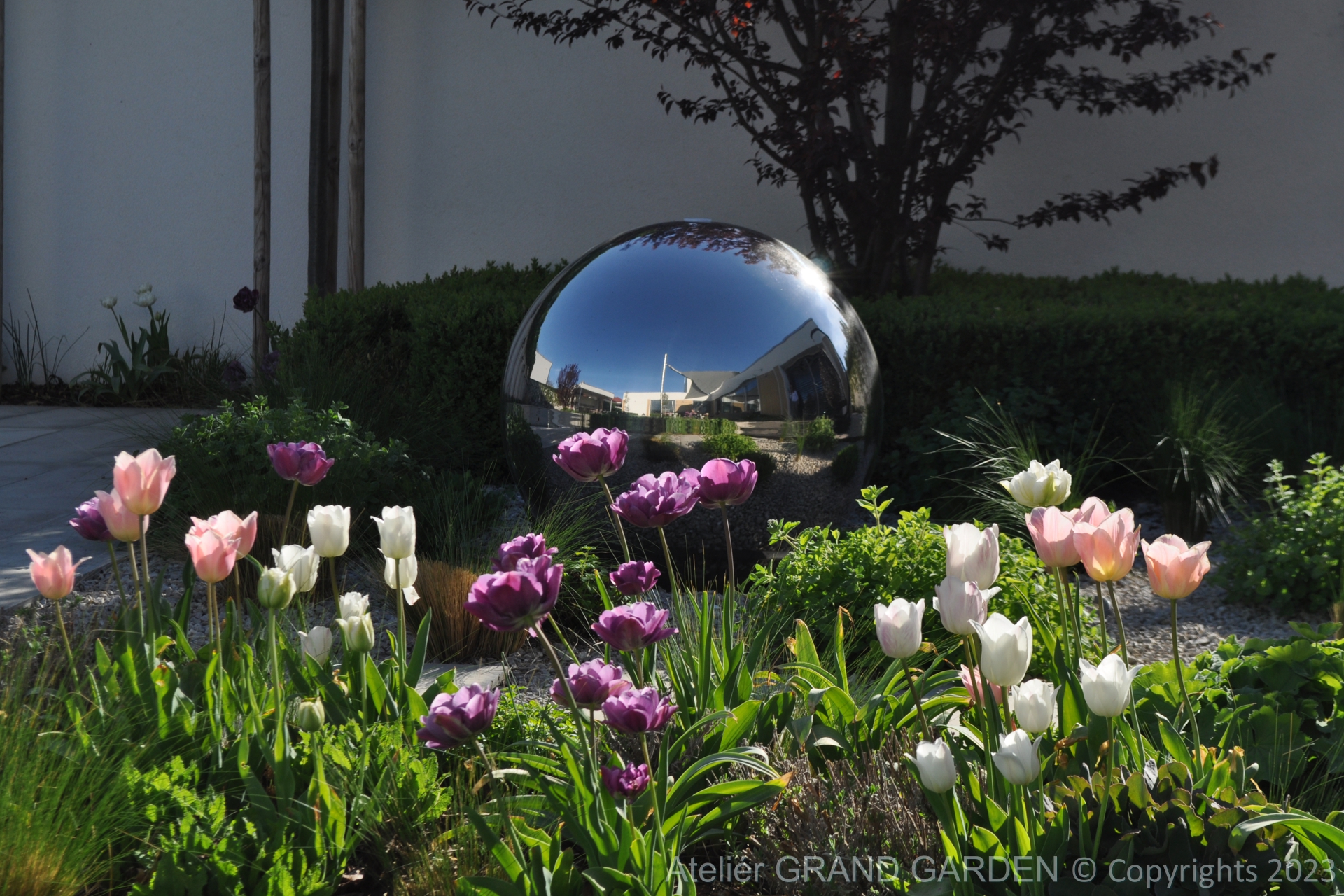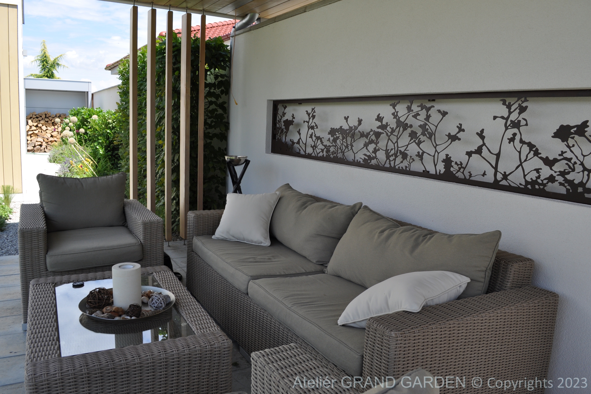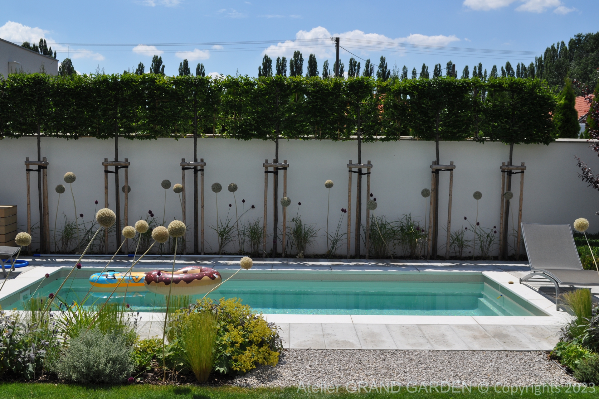 Elegantný moderný dom s čistými líniami a jednoduchými striedmymi materiálmi vyžadoval kompozične jednoducho riešenú záhradu, plnú detailov a prekvapení. Priestranná južná terasa pri dome pokrytá palubovkou z tropického dreva, jednoduchý a vzdušný prístrešok s multimediálnymi prvkami, bazén "rodinných" rozmerov, supersexi úložňa dreva so skrytým priestorom pre záhradné vybavenie, to všetko premieňa túto záhradu v kombinácii s estetickými doplnkami v modernú, elegantnú relaxačnú oázu. Premenlivá trvalkovo-trávová výsadba v kombinácii so vždyzelenými blokmi z krušpánov, vysokými hrabovými palmetami ako aj bohatá jarná výsadba cibuľovín oživujú a sprírodňujú strohé línie a zjemňujú charakter priestoru. To všetko v umiernenej rovnošate elegancie a jednoduchosti.