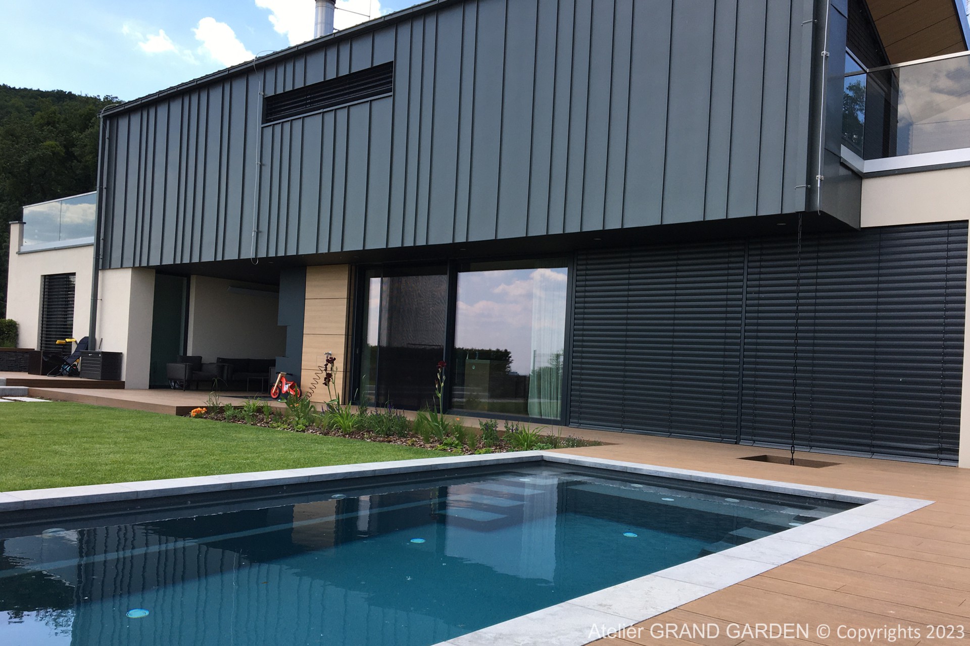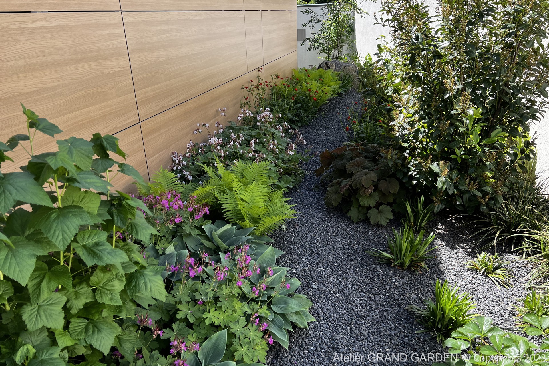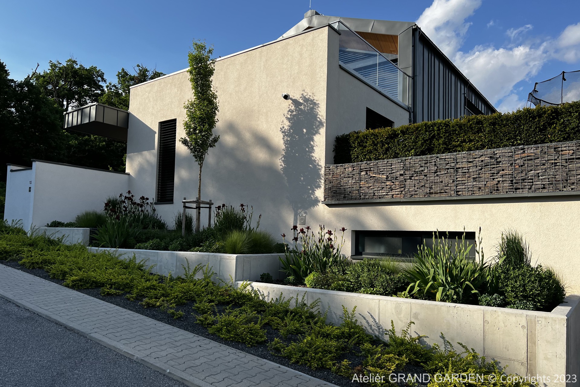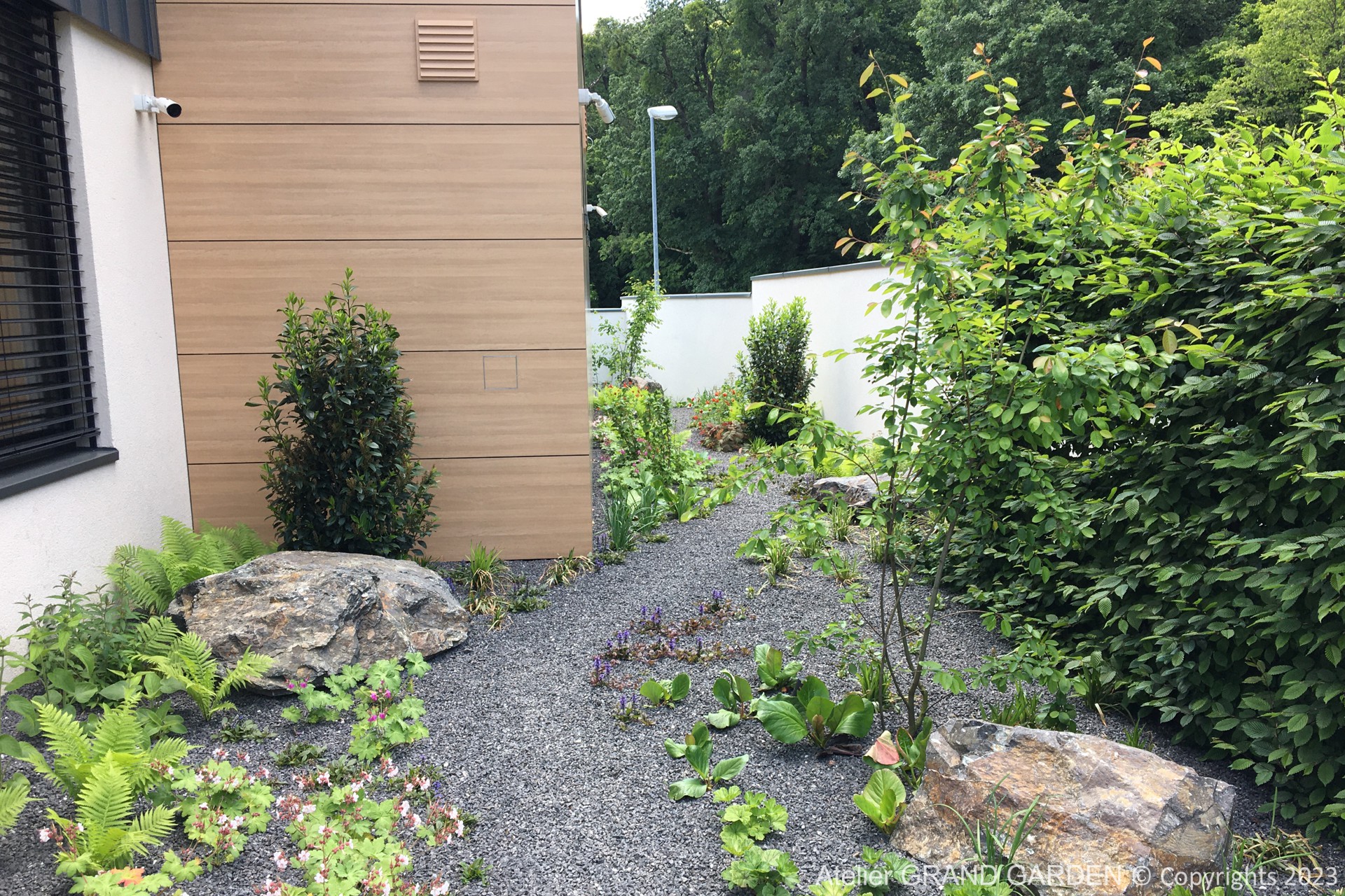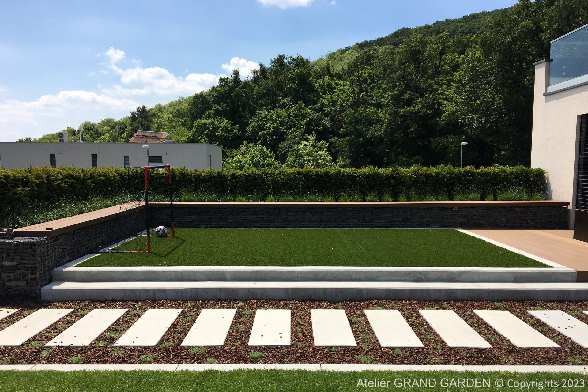 Progresívna záhrada je ukážkou symbiózy moderných technických a prírodných prvkov. Je súčasná v duchu, striedma výberom materiálov a tradičná použitím rastlín. Jej jednoduchá, minimalistická kompozícia, sa prispôsobuje pôdorysu domu. Moderné kompozitné materiály palubovky, keramický bazén, okraje záhonov a šľapáky z pohľadového betónu ju robia nadčasovou. Prírodné kamene ako Andezit či Melafýr v podobe gabiónov či balvanov jej zas prepožičiavajú prírodný náboj. Rastlinná schéma nesie znaky tradicionalizmu, bergénie, kosatce, pakosty, funkie, paprade, heuchery, zbehlíky či kuklík zjemňujú charakter záhrady a dodávajú jej punc prirodzenej, až vidieckej naturálnosti. Kompaktné kvetinové záhony, detská zóna s praktickým umelým trávnikovým povrchom, samočistiaci bazén a nadväzujúce kompozitné palubovky, moderný záhradný prístrešok , grilovací kút pri hlavnej terase či automatická kosačka robia záhradu nadčasovou a ľahko udržiavateľnou.