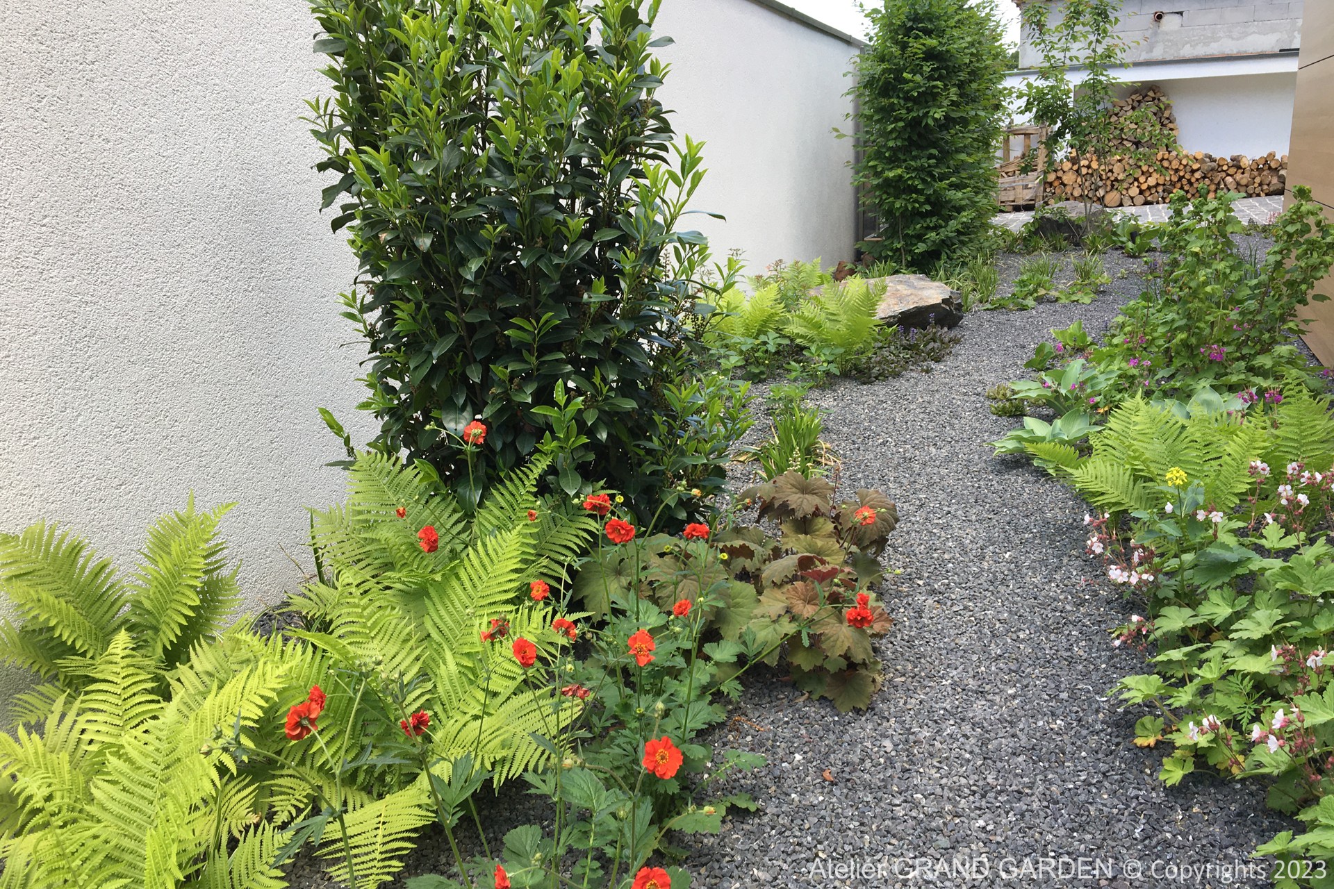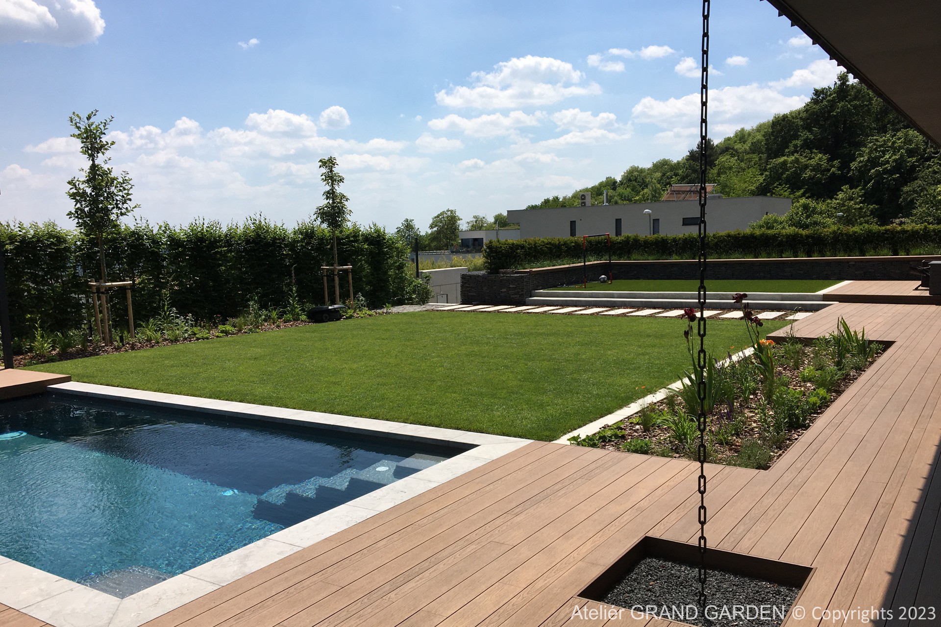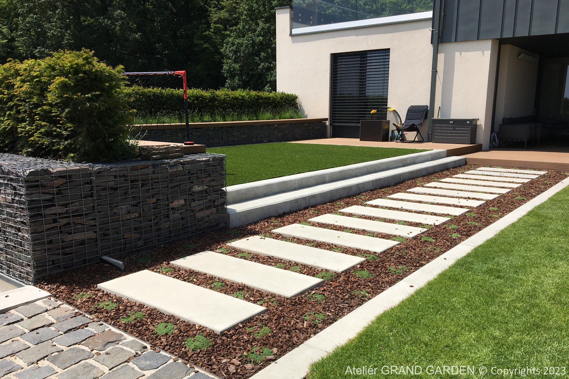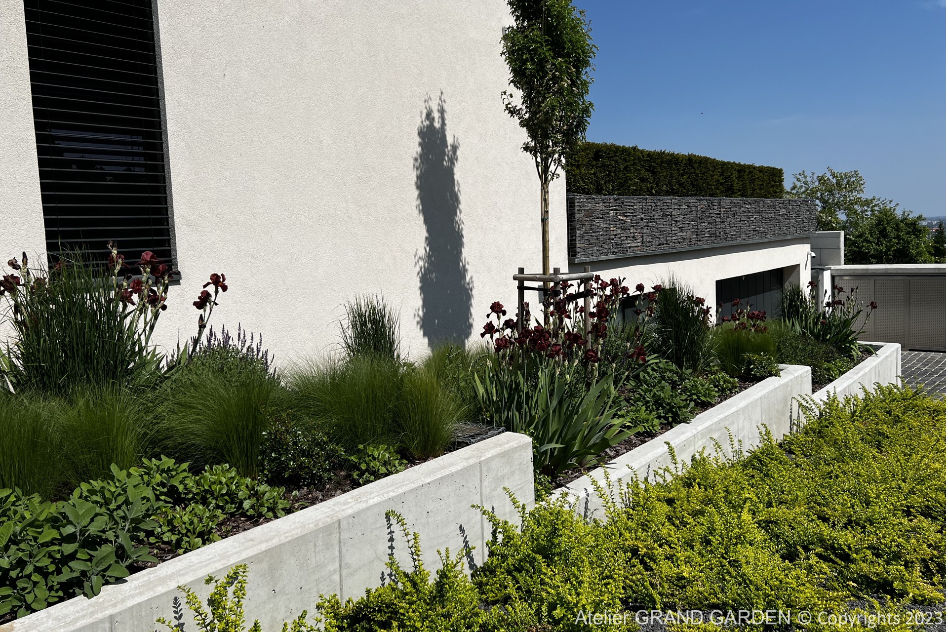 Progresívna záhrada je ukážkou symbiózy moderných technických a prírodných prvkov. Je súčasná v duchu, striedma výberom materiálov a tradičná použitím rastlín. Jej jednoduchá, minimalistická kompozícia, sa prispôsobuje pôdorysu domu. Moderné kompozitné materiály palubovky, keramický bazén, okraje záhonov a šľapáky z pohľadového betónu ju robia nadčasovou. Prírodné kamene ako Andezit či Melafýr v podobe gabiónov či balvanov jej zas prepožičiavajú prírodný náboj. Rastlinná schéma nesie znaky tradicionalizmu, bergénie, kosatce, pakosty, funkie, paprade, heuchery, zbehlíky či kuklík zjemňujú charakter záhrady a dodávajú jej punc prirodzenej, až vidieckej naturálnosti. Kompaktné kvetinové záhony, detská zóna s praktickým umelým trávnikovým povrchom, samočistiaci bazén a nadväzujúce kompozitné palubovky, moderný záhradný prístrešok , grilovací kút pri hlavnej terase či automatická kosačka robia záhradu nadčasovou a ľahko udržiavateľnou.
